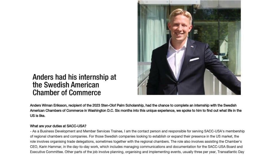 Anders Wiman Eriksson, recipient of the 2023 Sten-Olof Palm Scholarship, had the chance to complete an internship with the Swedish American Chambers of Commerce in Washington D.C. Six months into this unique experience, we spoke to him to find out what life in the US is like.