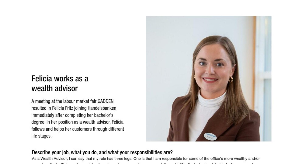 A meeting at the labour market fair GADDEN resulted in Felicia Fritz joining Handelsbanken immediately after completing her bachelor's degree. In her position as a wealth advisor, Felicia follows and helps her customers through different life stages.
