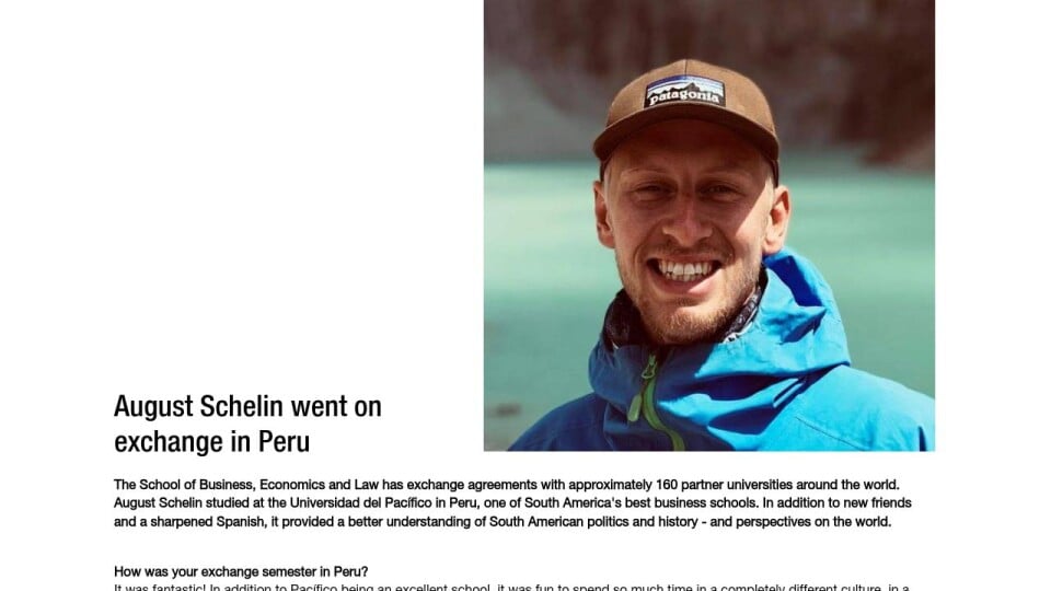 The School of Business, Economics and Law has exchange agreements with approximately 160 partner universities around the world. August Schelin studied at the Universidad del Pacífico in Peru, one of South America's best business schools. In addition to new friends and a sharpened Spanish, it provided a better understanding of South American politics and history - and perspectives on the world.