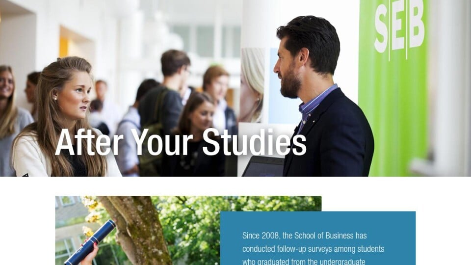 Since 2008, the School of Business has conducted follow-up surveys among students who graduated from the undergraduate program the previous year. The surveys provide answers to questions such as Where do students work today? How did they get their first job? and In which sectors do they work?