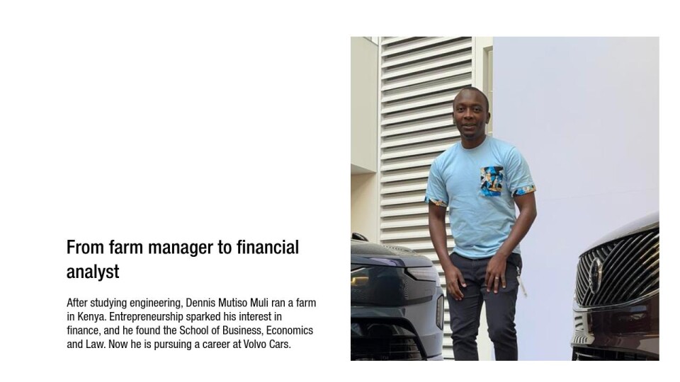After studying engineering, Dennis Mutiso Muli ran a farm in Kenya. Entrepreneurship sparked his interest in finance, and he found the School of Business, Economics and Law. Now he is pursuing a career at Volvo Cars.