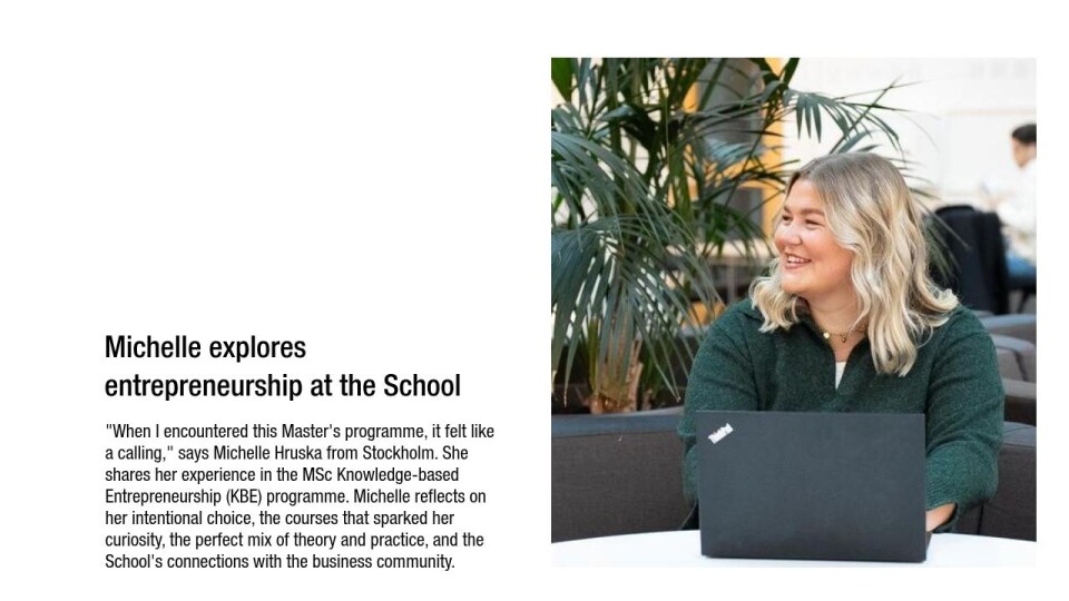 "When I encountered this Master's programme, it felt like a calling," says Michelle Hruska from Stockholm. She shares her experience in the MSc Knowledge-based Entrepreneurship (KBE) programme. Michelle reflects on her intentional choice, the courses that sparked her curiosity, the perfect mix of theory and practice, and the School's connections with the business community.